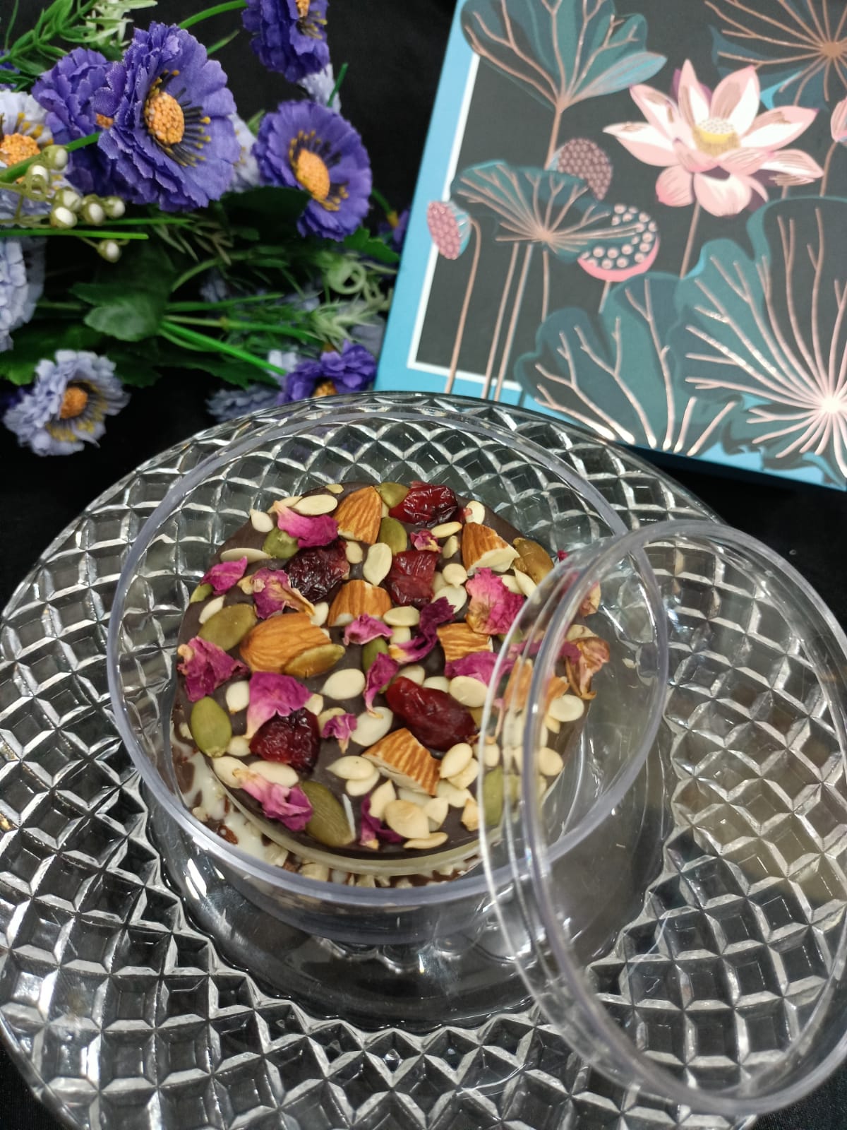 The Assorted Chocolate Pizza is a popular, crunchy sweet treat that fuses tropical mango pulp/pieces and crisps into a rich chocolate base (often white chocolate), perfect for gifting or snacking.