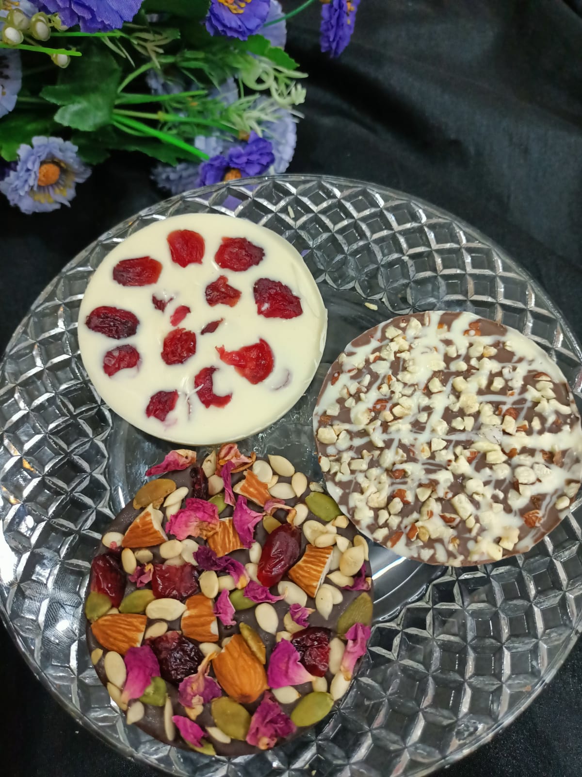 Almond Praline Chocolate Pizza, Mixed Seeds Dry Fruit Chocolate Pizza, Orange Cranberry Chocolate Pizza